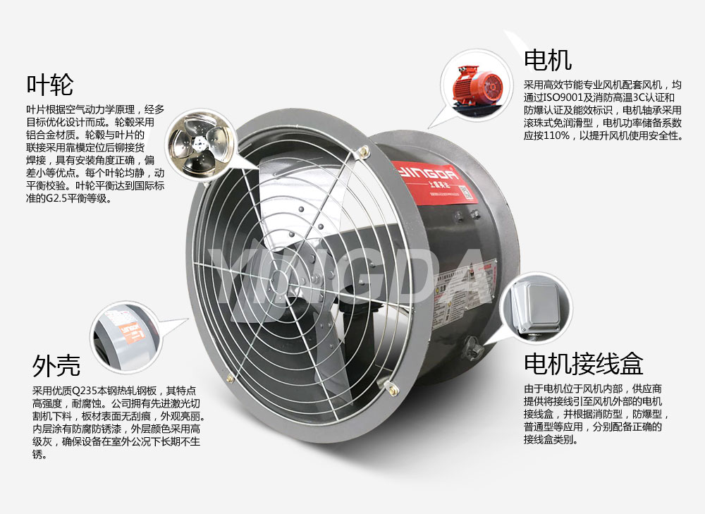1.2.按直徑分為250~1100mm共14種規(guī)格,每一規(guī)格風機葉片數(shù)都為4片,參數(shù)范圍廣,風量800~65000 m3/h,風壓40~470Pa。風機可壁式安裝也可管道式安裝。